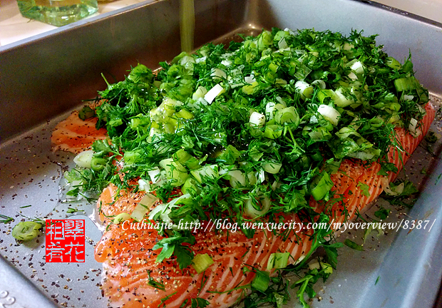4、将拌了油和柠檬汁儿的翠绿香料菜均匀铺在鱼身上,