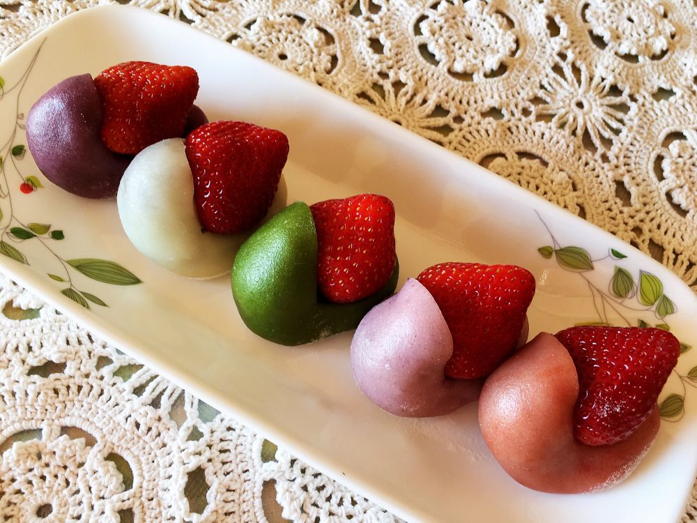 是吃的,是和式点心,用糯米粉做的皮。日语叫“和果子”。