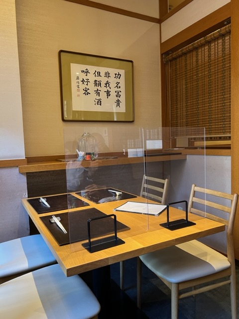来到店门口,马上就有店员过来问:预约了吗?答:没有。店员:请稍等一下。过了一会儿店员:有一个两人的桌子,有点局促,可以的话,就请进吧!