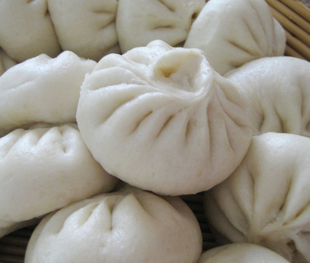 D:发好的面团放面板上,加 1/4 茶匙泡打粉,揉、揉、揉~~~~ 揉的多些比较好!最好揉100下以上,揉好的面分成小剂,擀成中间厚、边上薄的皮,包上馅,放回还温暖的烤箱、醒面20分钟。