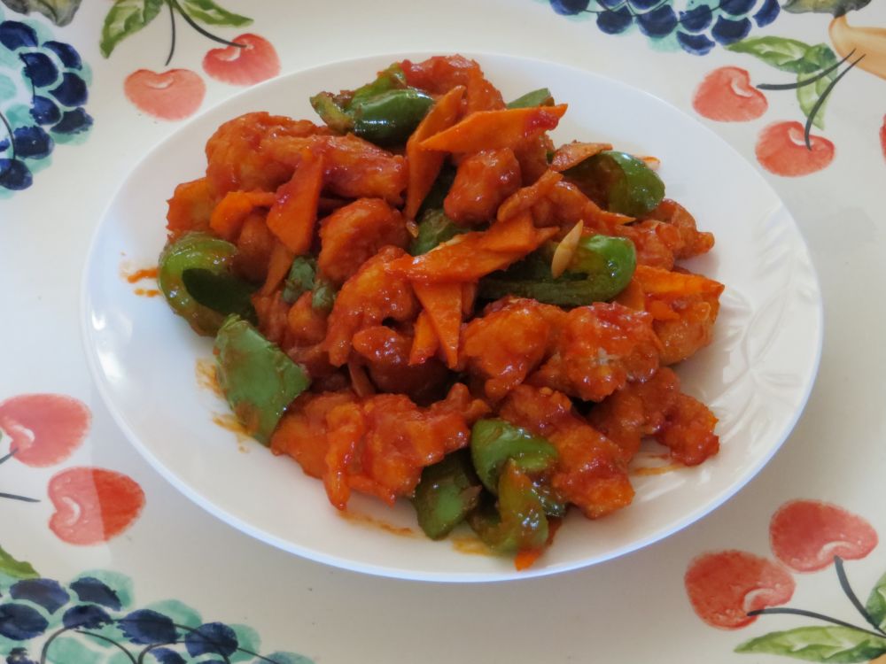 鸡肉切大块用料腌一下(按自己喜欢的口味,放少许盐),腌好后放干淀粉和干面粉(淀粉和面粉比例差不多是3:1,主要是淀粉),抓匀、抖掉多余的干粉,下油锅350度炸到8成熟捞出来,然后炸青椒或是洋葱什么的配菜,每样炸一分钟就好了。 然后油温调到400度后、再把鸡快放油锅里复炸到脆脆的,同时炒锅放油爆香姜蒜,放 ketchup (多多益善),熬开,鸡快捞出来直接放炒锅里菜也入锅兜匀(这步要快一点)出锅就好了。趁热吃,外酥里嫩!