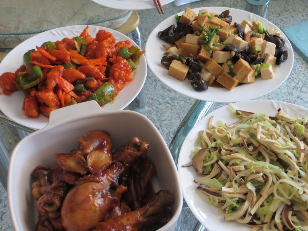 酸甜鸡、可乐鸡鸡腿、白菜香干、双色豆腐(豆腐烩冻豆腐)