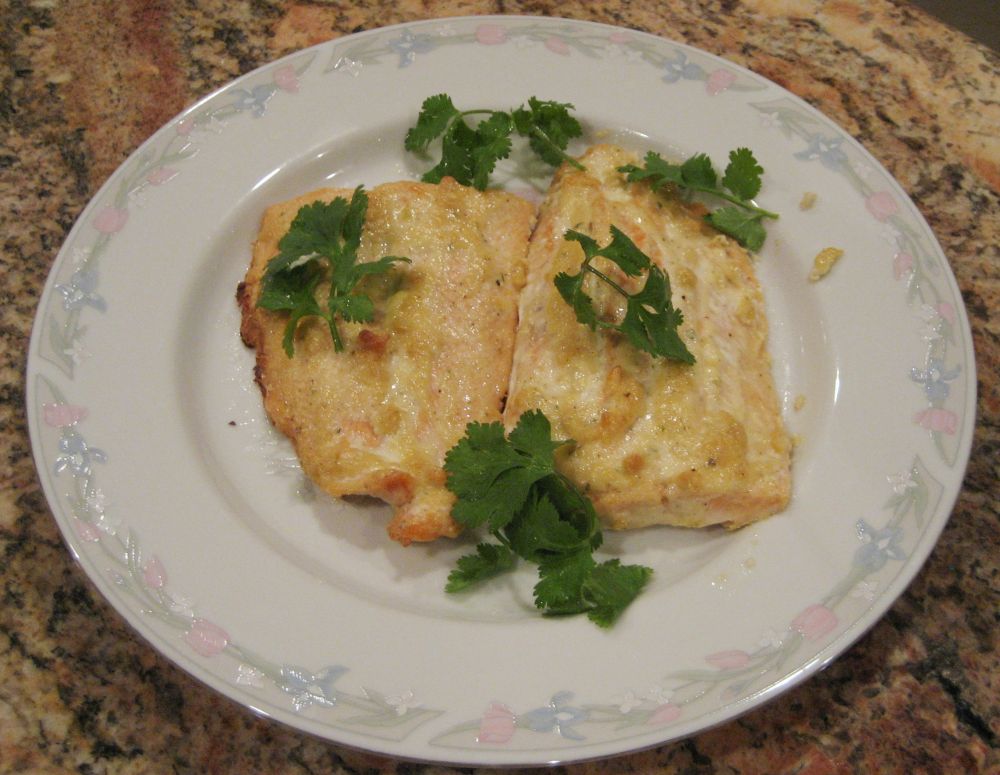 1、Salmon 鱼一片(一磅左右)洗净,擦干水份备用,烤箱预热到375F度