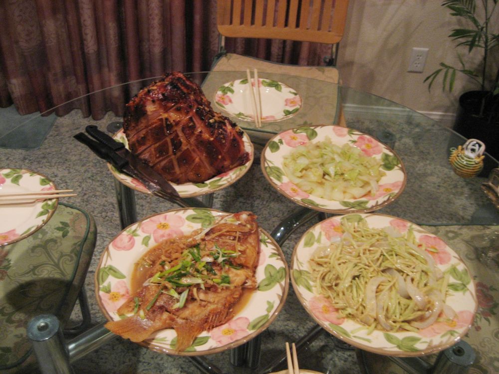 晚餐全家福:蜜汁火腿、红烧红鱼、拌黄瓜拉皮、素炒白菜
