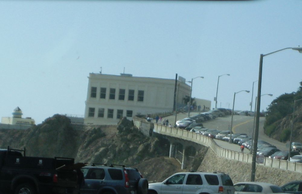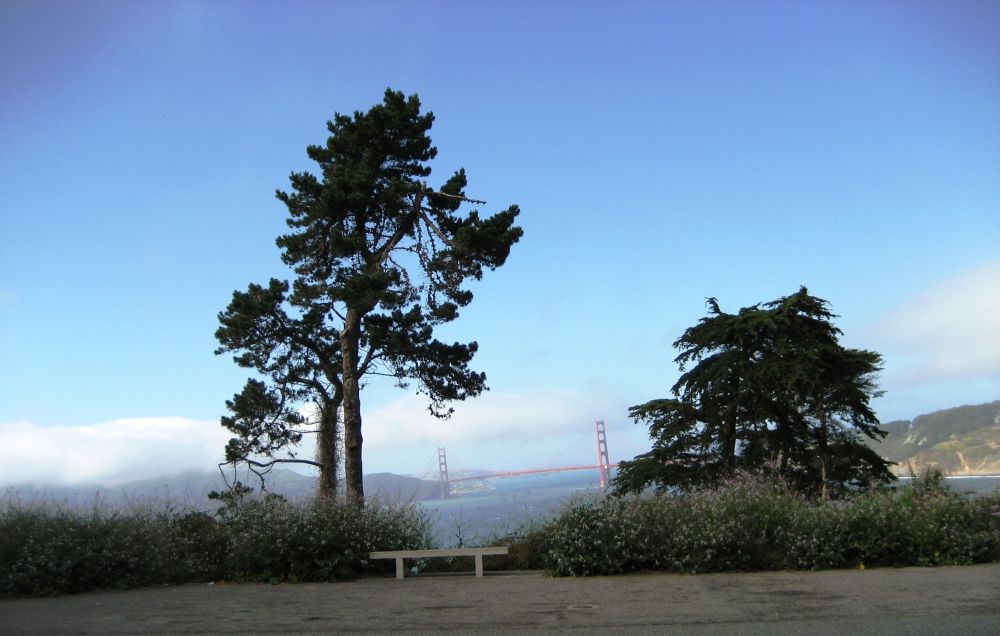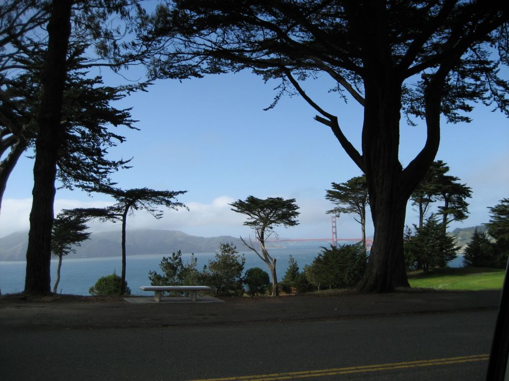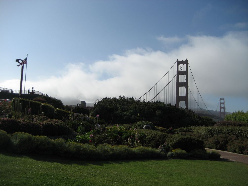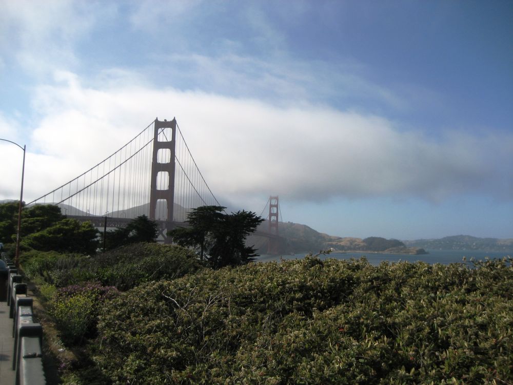 雾中只能依稀的看见金门大桥的红色桥架(图中间偏左一点)