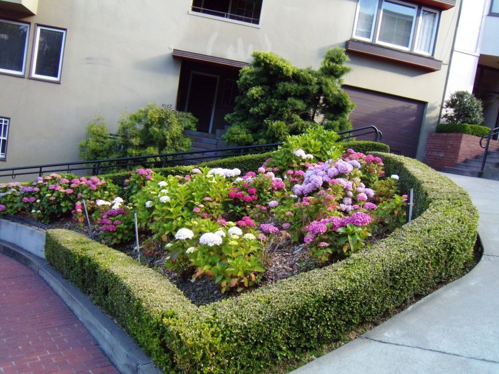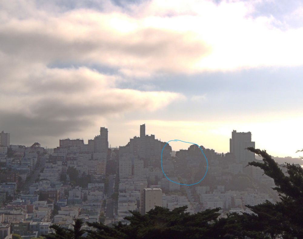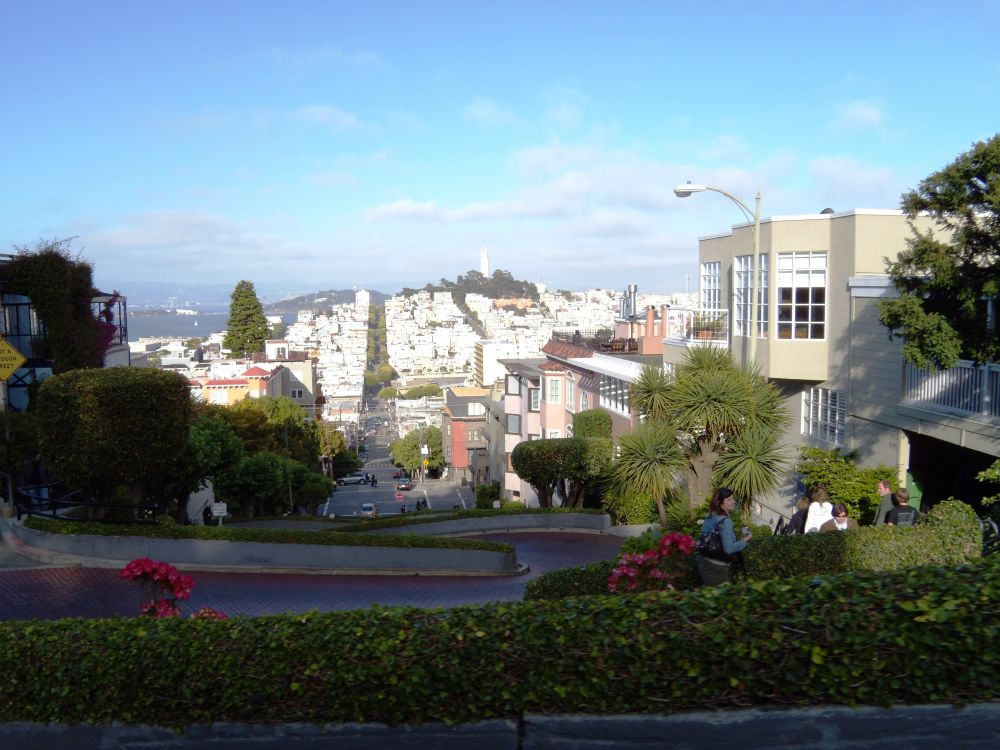 上到 Telegraph Hill 看刚刚走过的九曲花街(蓝色圈内)