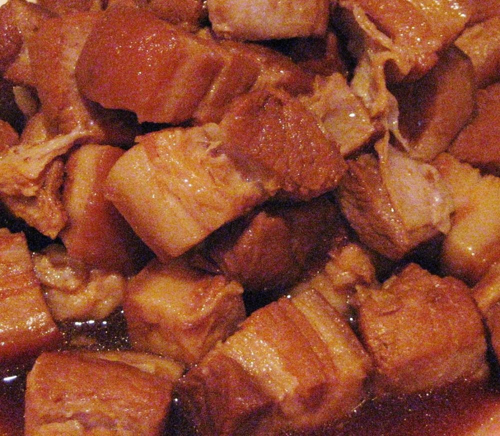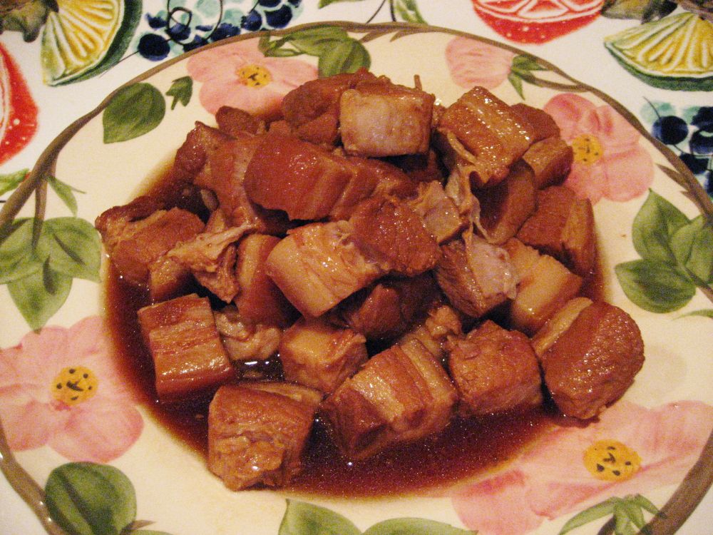 材料:带皮五花肉2磅、1茶油、3大匙白糖、2颗八角、米酒2大匙、2大片姜,适量酱油、盐、水