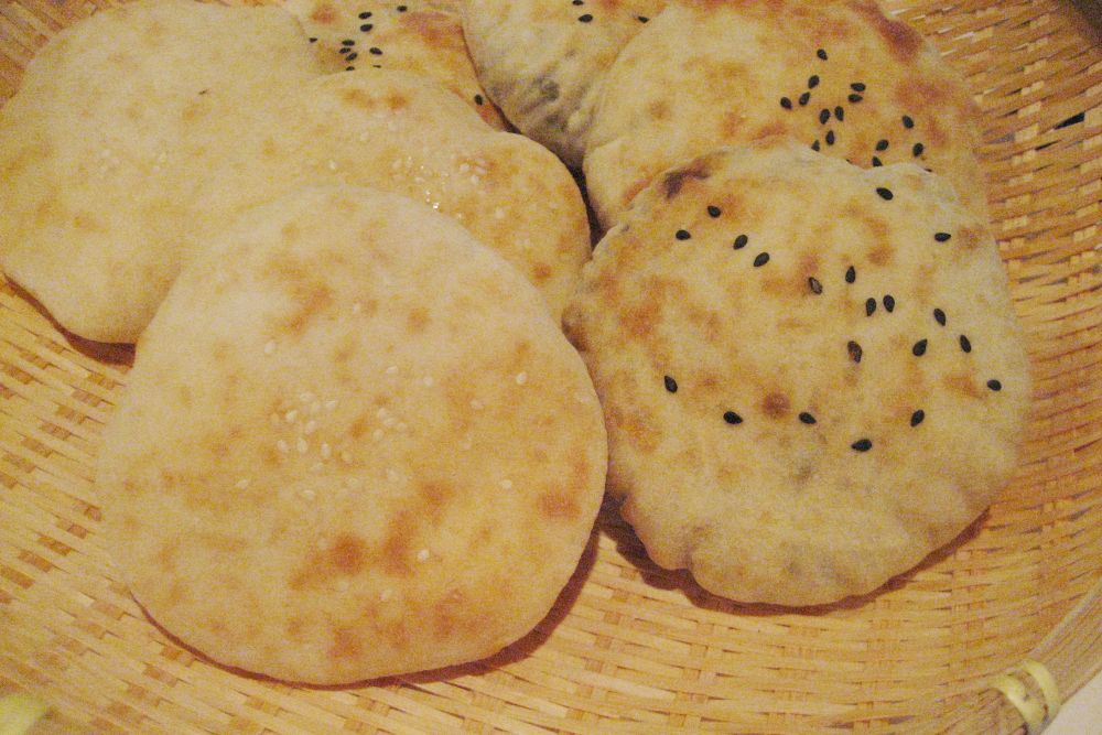 刚出炉的火烧,上有黑芝麻的是黑芝麻馅和红豆沙馅的,上有白芝麻的是没馅的