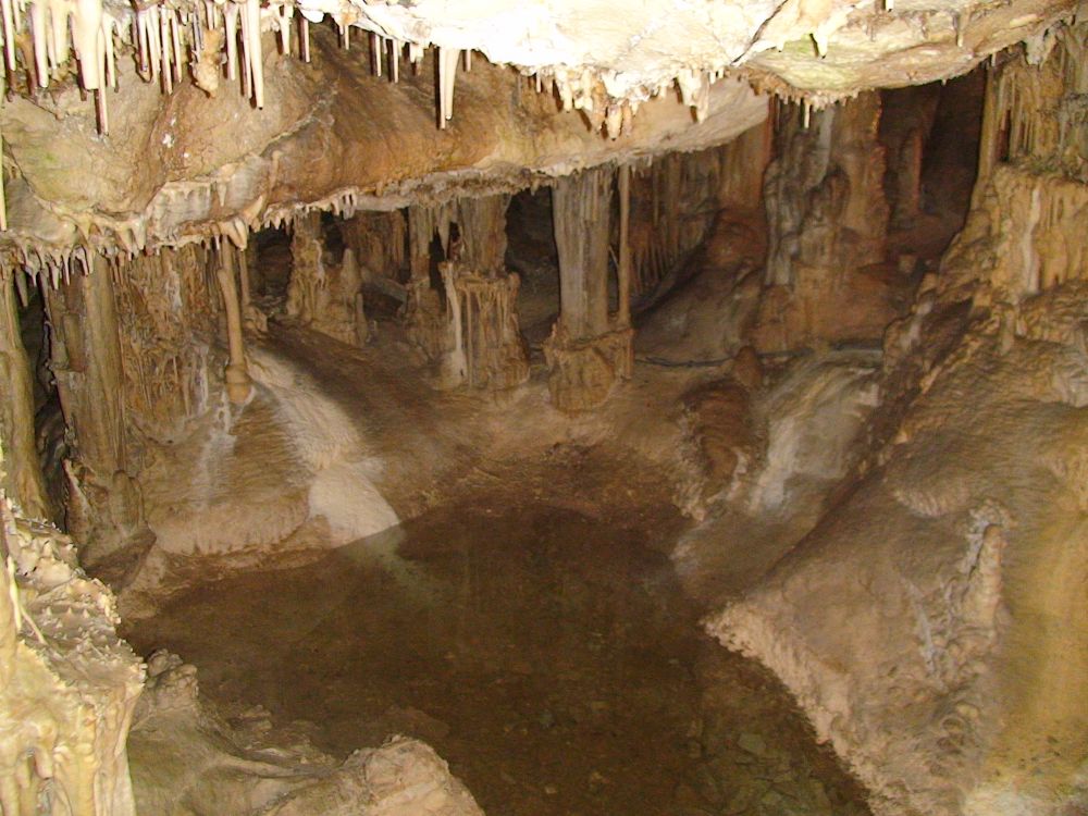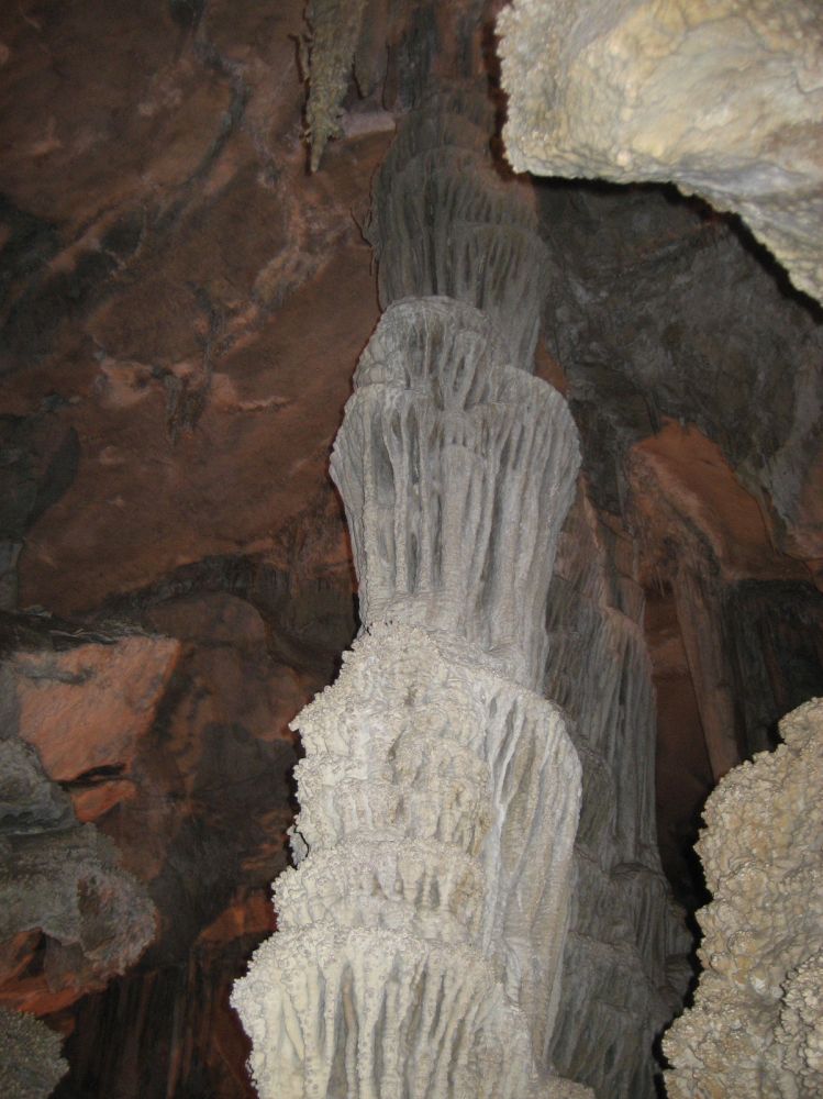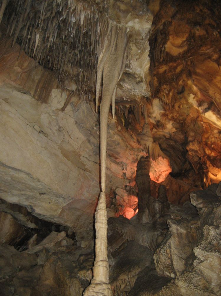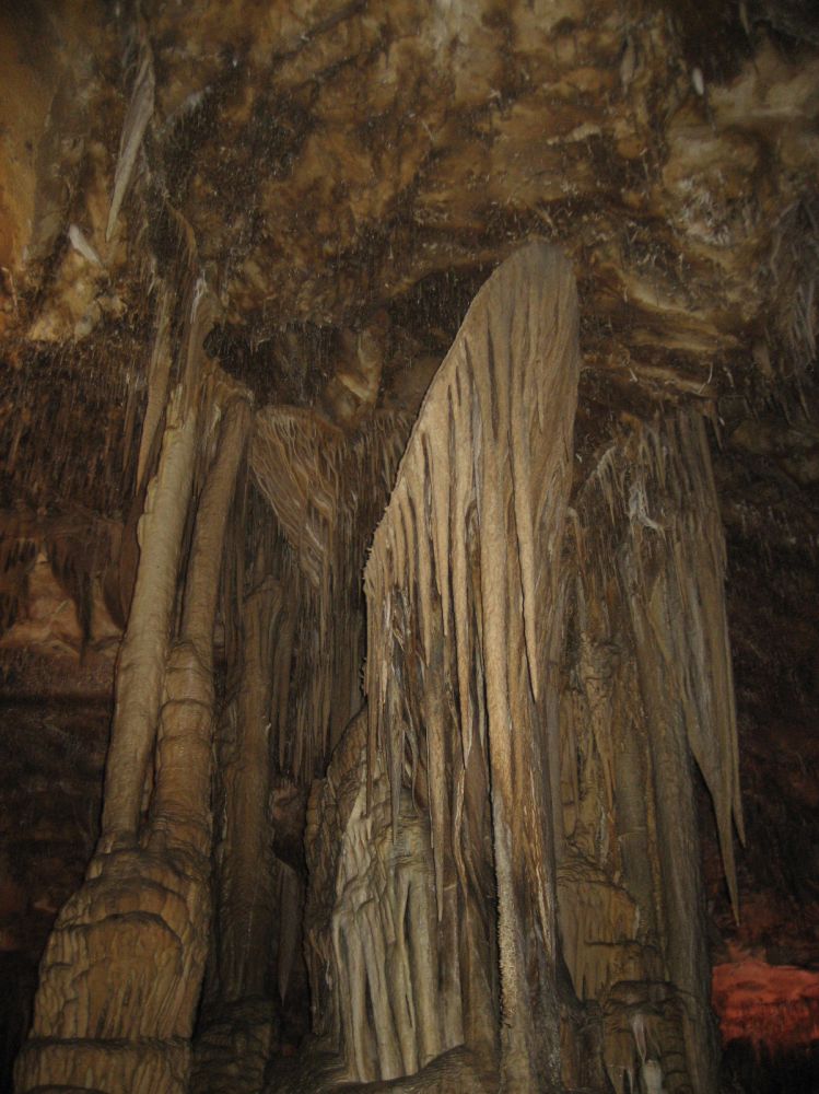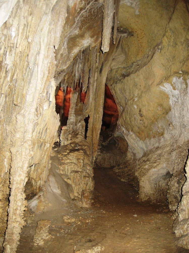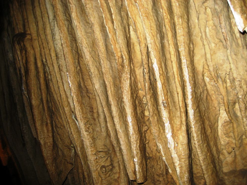 这是非常狭窄的路边上象竖琴一样的钟乳石,早年进洞的人用木棒敲击它们会发出不同的声音,你现在看见的损坏部分就是当年留下的。
