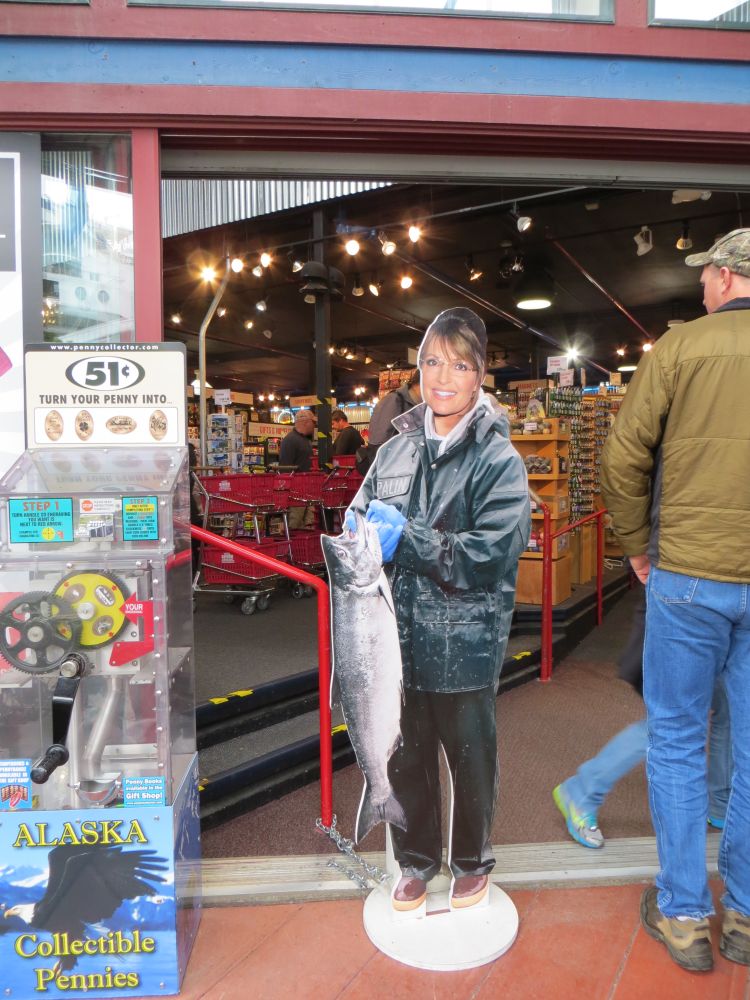 商店门口的摆着阿拉斯加州长的照片牌,有很多人拍合影呢,老公说:你可别跟她合影,哈哈~~~