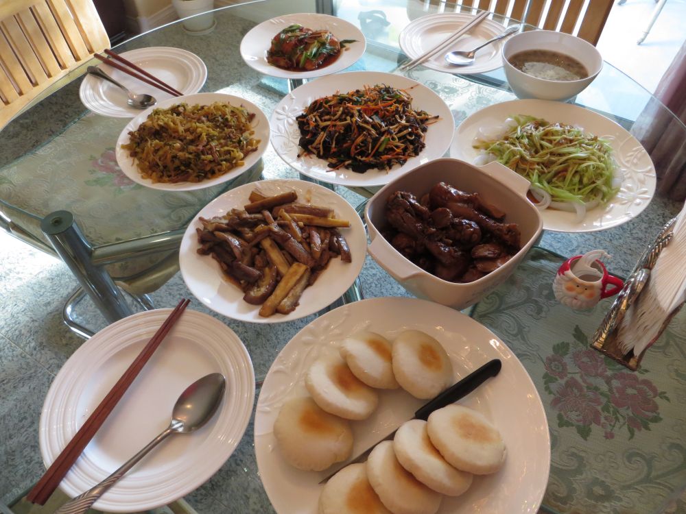 上个晚餐:空心小烤饼、茄子、可乐鸡腿、素什锦、酸菜粉、三纹鱼、黄瓜拉皮、绿豆粥