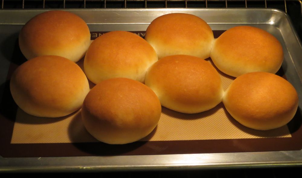 做法: 按顺序放入面包机,选 甜面包档 1 茶匙半 发酵粉 半 杯鲜奶油+ 半 杯牛奶 加热成温的 2 大匙糖 1 个蛋 2 平杯中筋面粉+2 大匙面筋粉(或2杯高筋面粉) 1/4 茶匙盐。 面包机完成和面发酵成两倍大,再拿出来切成8份,一个一个揉滚成光滑面球,静置5分钟左右,按扁成圆饼放入烤盘,第二次发酵40分钟左右成两倍大。 烤箱预热 375F 度,烤12分钟。