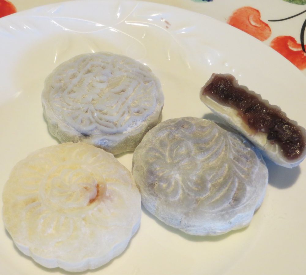 做了三种馅的冰皮月饼:柴薯、红豆沙、椰蓉葡萄干