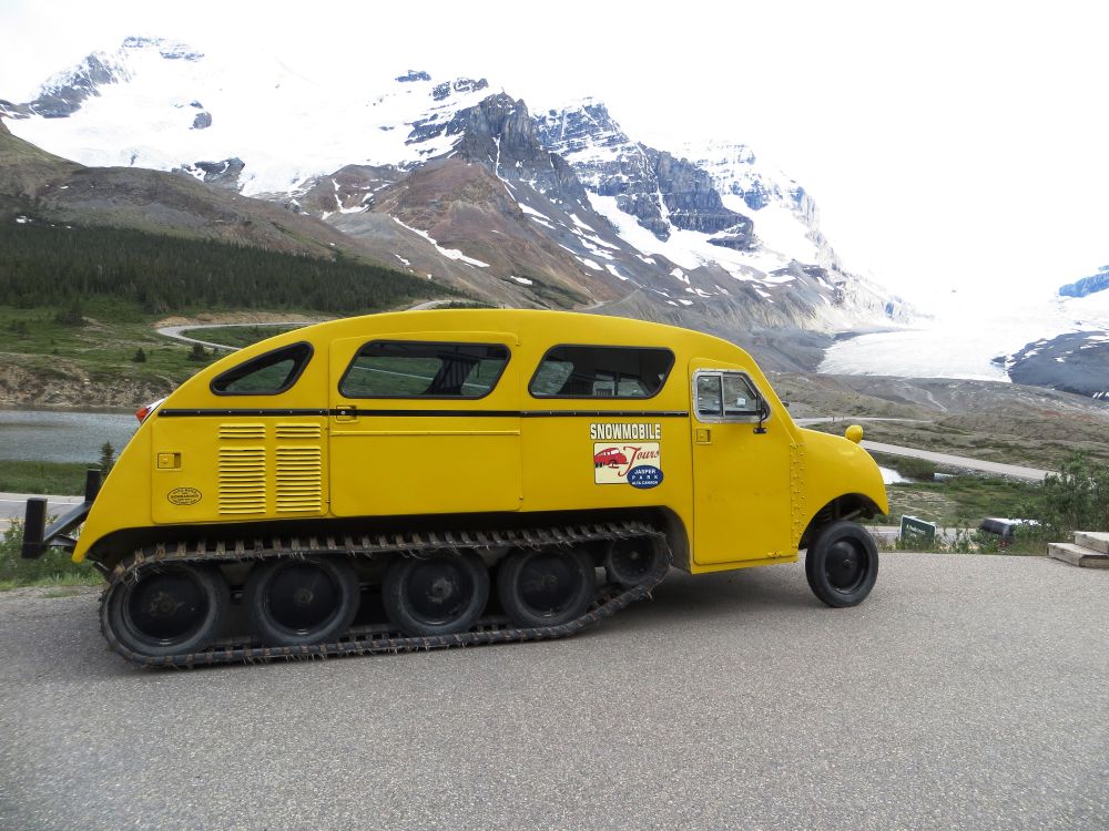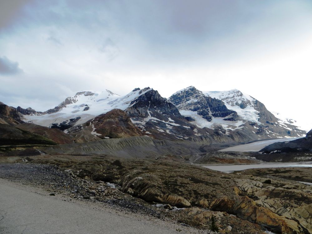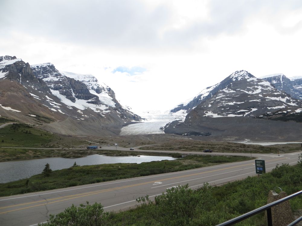 21、右边平坦的就是哥伦比亚冰原 Columbia Icefield,山峰上是相对比较小的一个个冰川