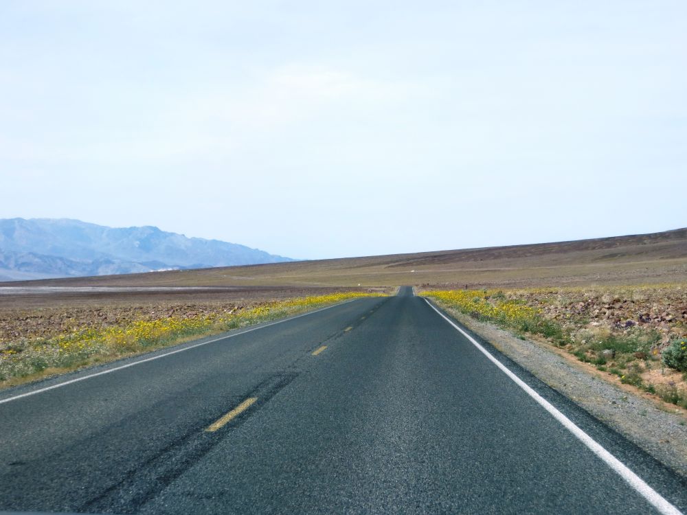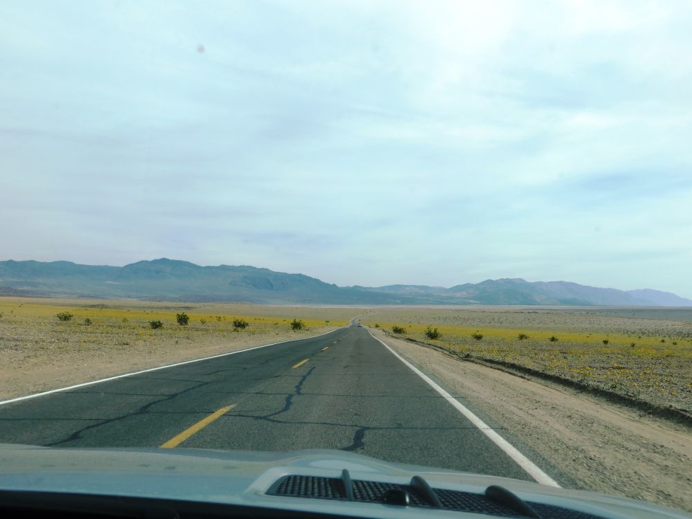 从拉斯维加斯去死亡谷有好几条路可以走,本来想走最有风景的一条路,但是一查路况还有很多地方至今还在淹水没有开放,所以就选了最近的也是最好走的一条路:95号北转373号,再转190号,我老公一上路就如脱缰的野马一路狂奔,开的不到2小时就到了。