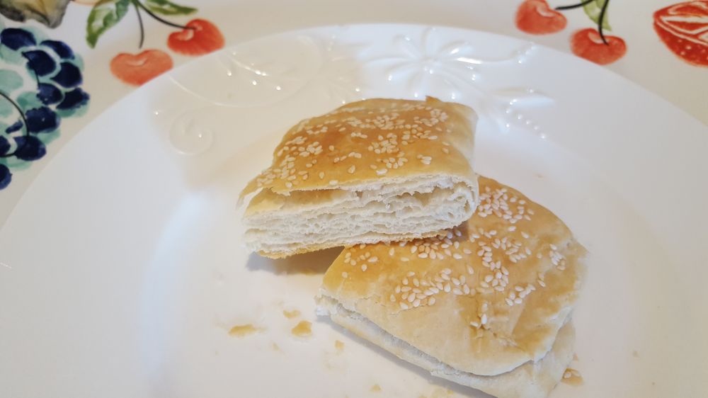 4、最后一次擀成巴掌大小,刷兑了水的蜂蜜水,撒芝麻,用擀面杖把芝麻滚入面里。
