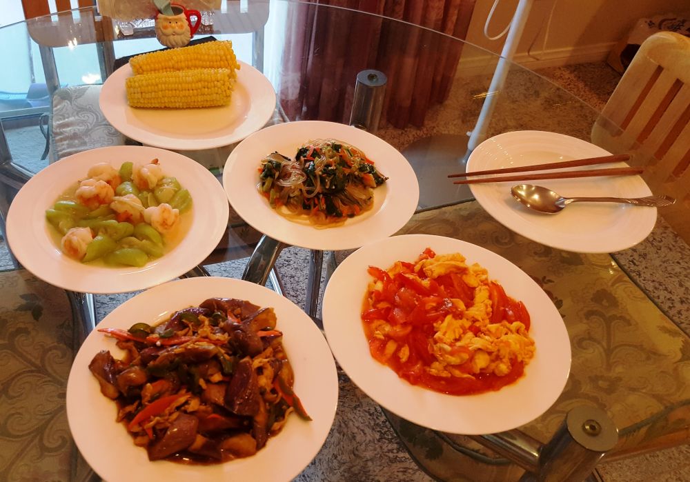 5、虾仁丝瓜,韩式拌菜,西红柿炒蛋,鱼香茄子,煮玉米