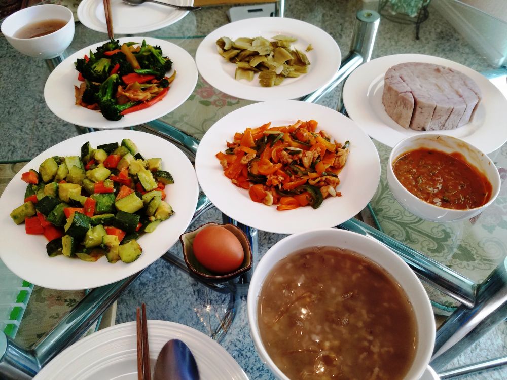 角瓜拌牛油果、炒西兰花,清炒苦瓜、彩椒鸡肉、芋头醮酱、绿豆粥