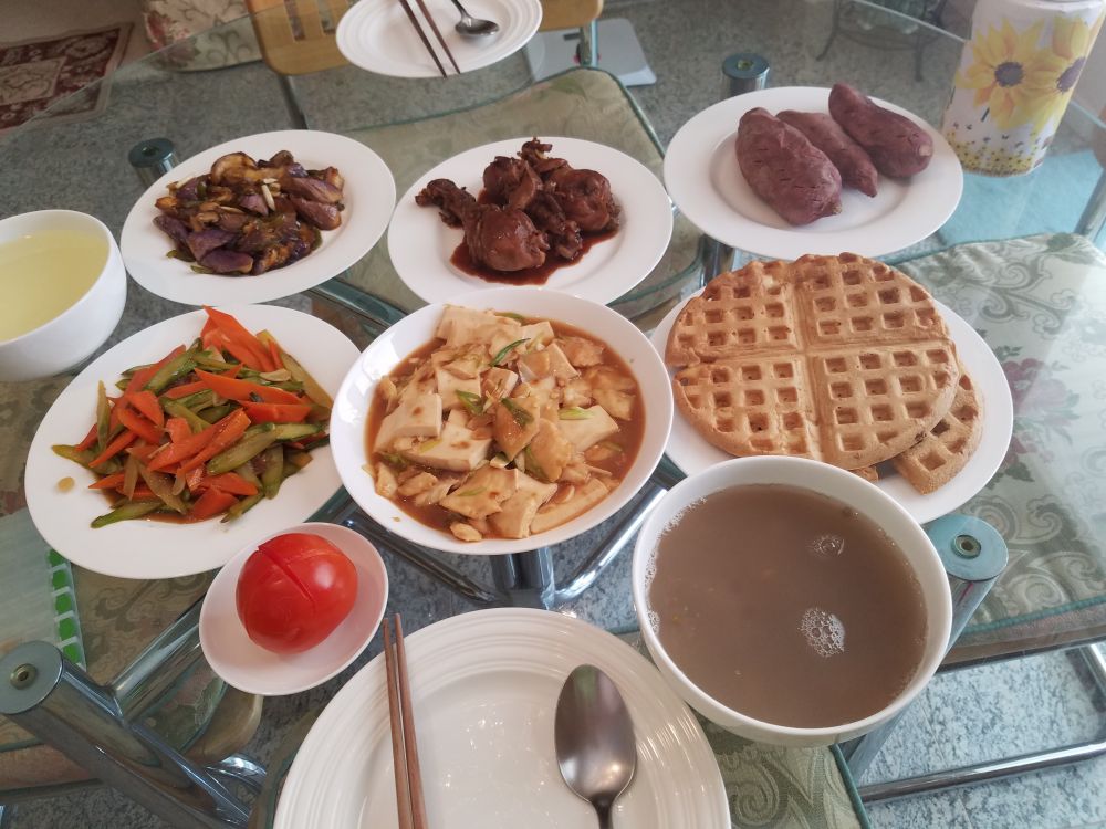 可乐鸡腿、烧茄子、炒芦笋、鱼片豆腐、烤地瓜、自制华夫饼、绿豆汤