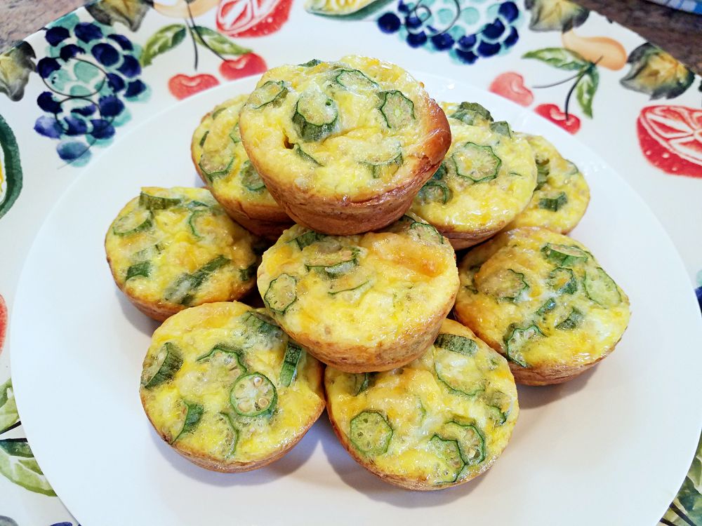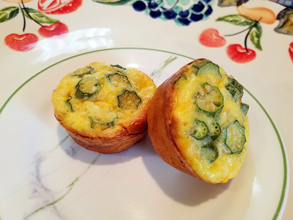 秋葵蛋挞:我用面包筒做的底,里面是秋葵+鸡蛋+芝士,375度烤了20分钟