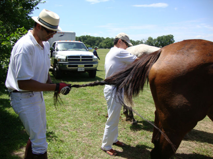 骑手们在系扎马尾(参赛的马需将马尾扎起,以防缠拌球杆出意外)