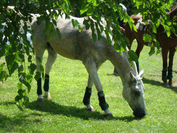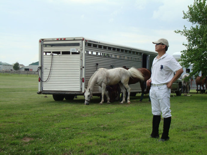 马球友谊赛将在正午12:00开始。我们入场时,看到马主们的马儿都已乘“专车”提前抵达,在树荫下备鞍、上绑腿,整装待发:
