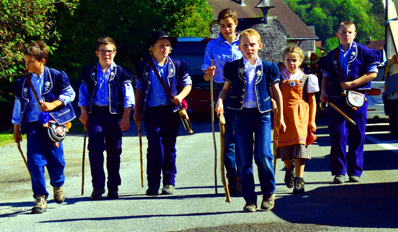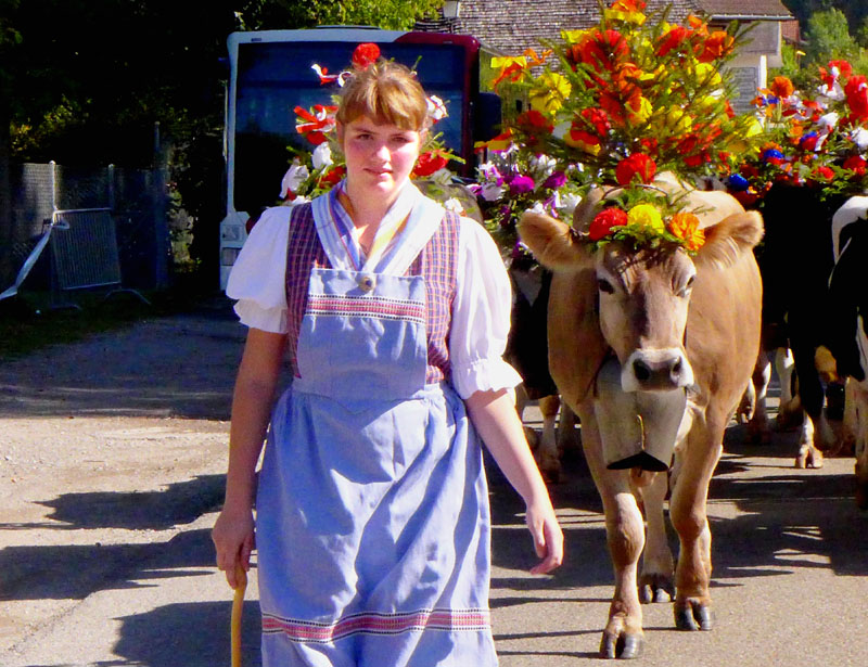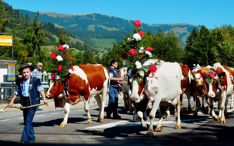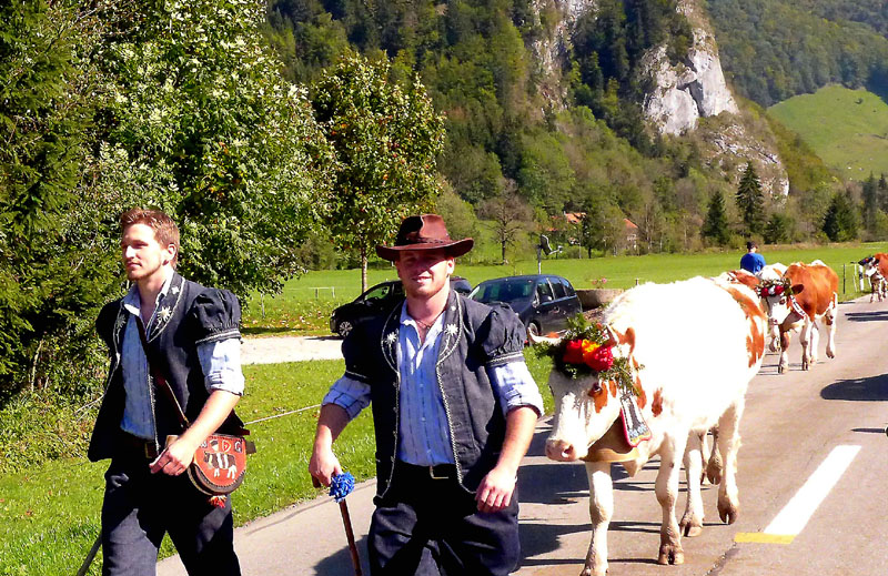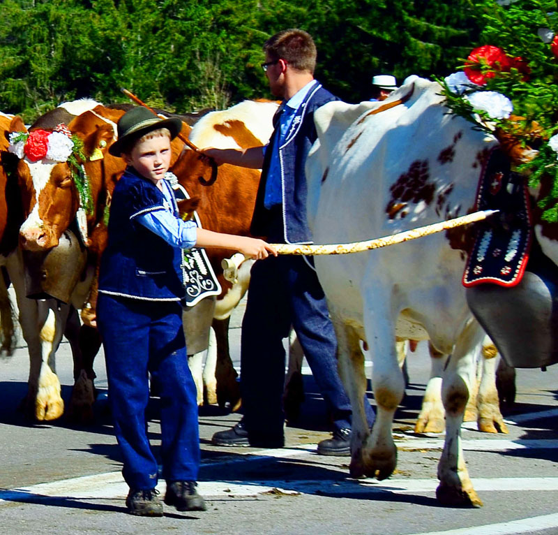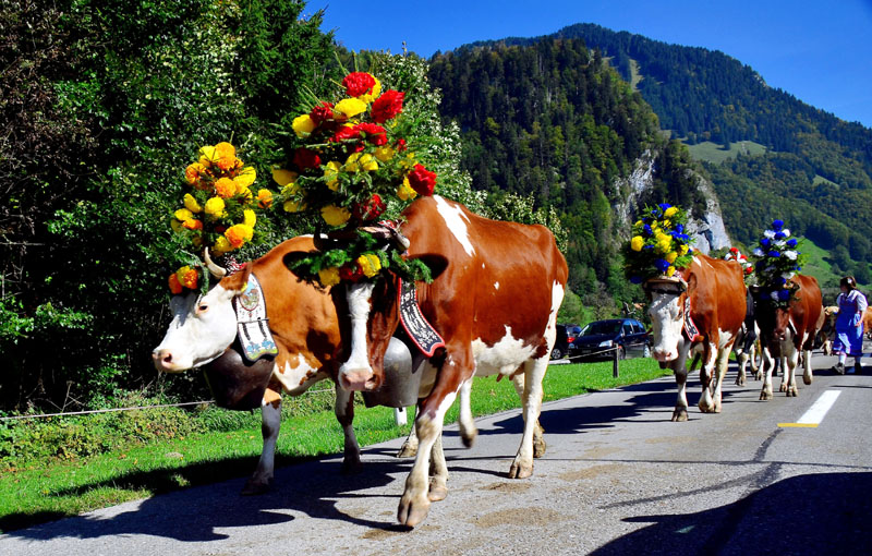 当我们的车驶入一段比较宽敞平直的乡间公路,前面的车辆突然明显减速,之后便一辆跟一辆地停靠于道边,都不再往前开了。我们正纳闷前方是否出了交通事故,只闻一阵叮叮咚咚的铜铃声由远而近,紧接着一长列披戴着“凤冠霞帔”、脖子上系着大铃铛的牛群,摇头摆尾兴高彩烈地朝我们这边纷沓而来。每头牛身旁都跟随着穿传统服装、有男有女有长有幼、神气十足的牧牛人!原来我们碰巧“遭遇”了本地年度奶牛选美大会——散场的盛况,公路上所有车辆都要给尊贵的“选手”们让道。呵呵,赶得早不如赶得巧,虽然被耽搁了十几二十分钟行程,我们免费观看了一场民俗表演,我和先生钻出车门,乐得抢拍下这一幕有趣的场景。在瑞士,我们几乎在每家礼品店都能看到大大小小制作精细的美丽铃铛——原来这就是大名鼎鼎的阿尔卑斯山牛铃。瑞士人民喜食奶酪和奶制品,所以奶牛们的地位水涨船高、不容小觑。