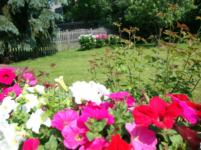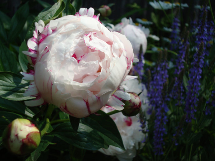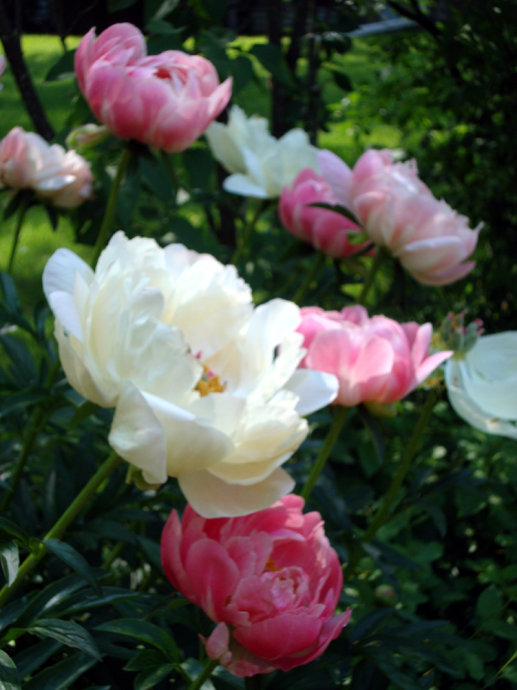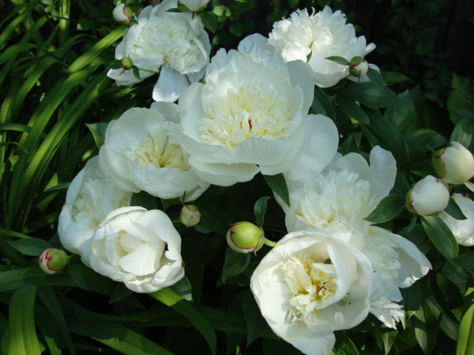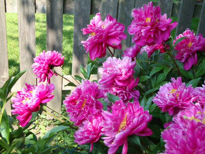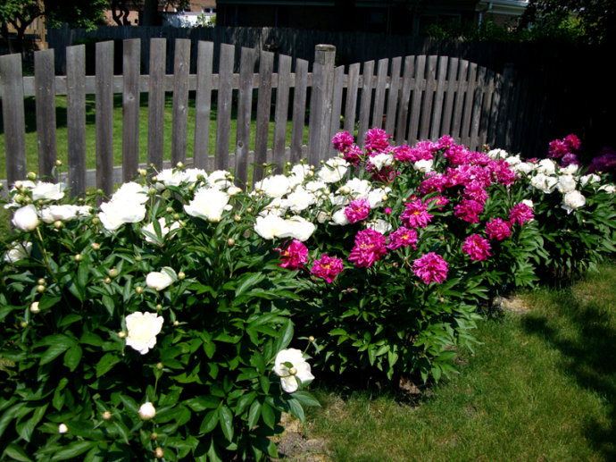 我现在居住的房子(2001年搬进来的)坐北朝南,前房主已经栽下一些芍药,我们又陆续补种了一些,好像有春天也有秋天栽的,有的过两年以后才开出花来,或许你等等会开花的。原来我家后院东西两边的阳光都能晒到,后来院子里灌木长大了树荫增多,新邻居家有大狗和小朋友又修了栅栏,光照没有以前那么好了。我曾经把完全背阴了的花移栽到有日照的地方。祝你早日赏花成功! :)
