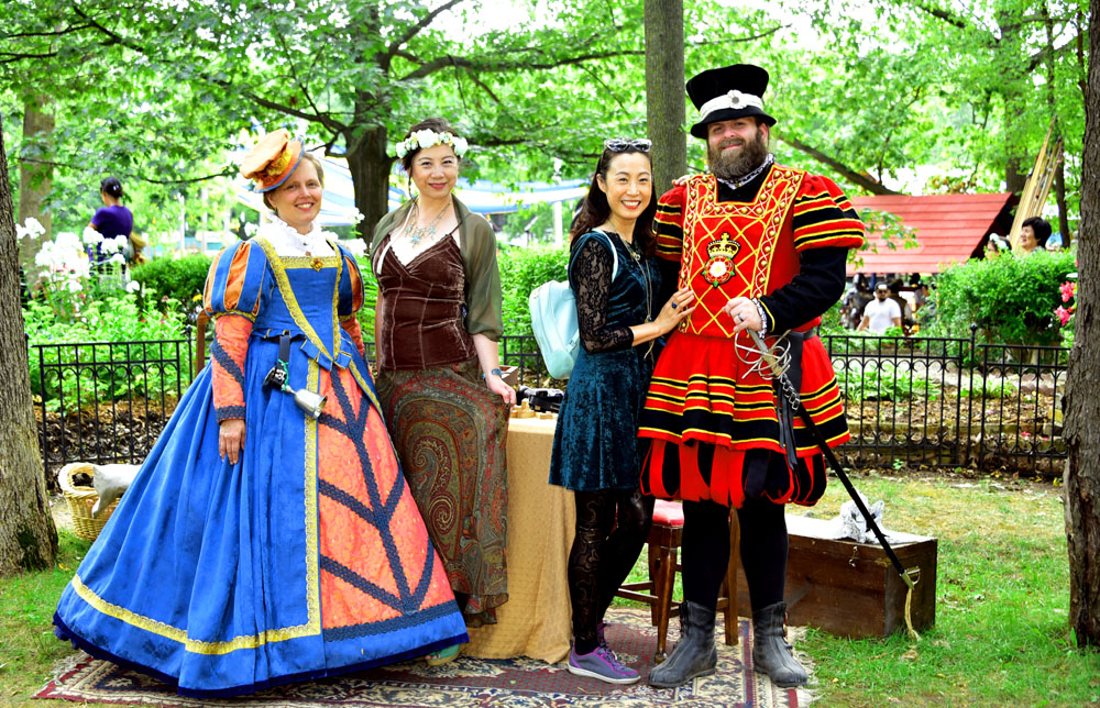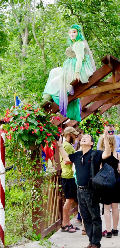 上周六天气好,我们和朋友一起去那里玩了一天。公园里那真是时光倒流,阴差阳错,五彩缤纷,老少欢喜。众人打扮得五花八门,千姿百态。从少年亚瑟王,中世纪的王公贵族,骑士僧侣,贩夫走卒,一直到神仙天使,妖魔鬼怪,外加工业革命时期的绅士淑女,以及戴饭盆样头盔的英军士兵,应有尽有。除此之外,还有很多娱乐活动场所和小商店餐馆和酒吧。那真是一个people watch 的绝好去处,我家御用兴高采烈地扫了不少人像。住在附近有兴趣的朋友们不妨去那里散散心。该公园在整个夏日的周末开放,一直到劳工节的长周末后才结束。