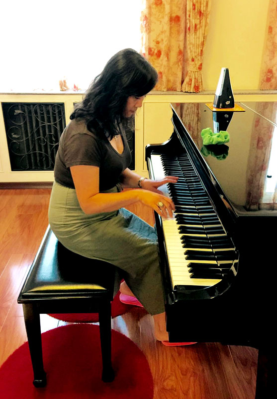 餐后,杨杨请我们去她舒适安逸的家宅小坐,饮茶吃水果(其中有她自家院子里摘的葡萄,又香又甜)。兴之所至,我们还一起弹琴唱歌: