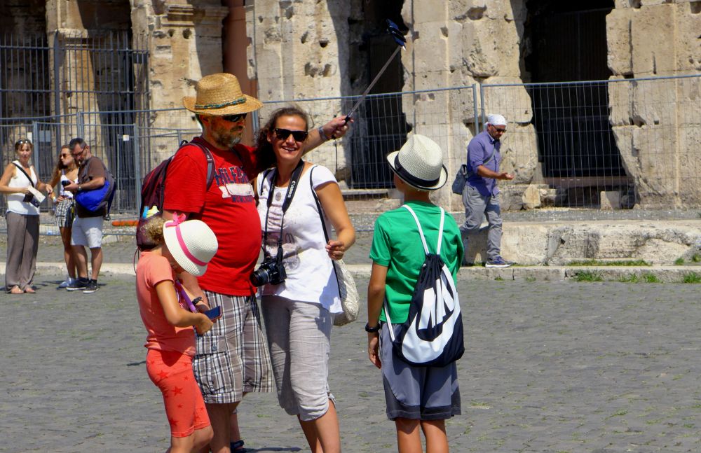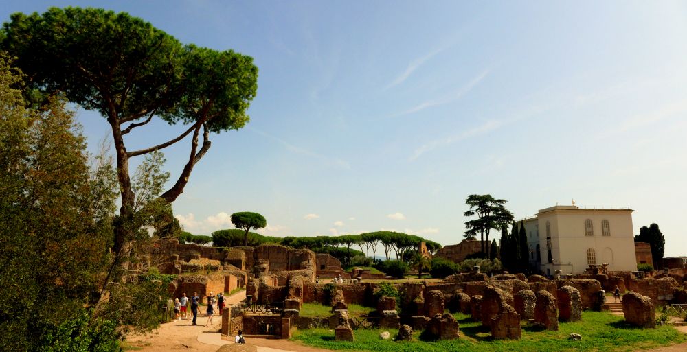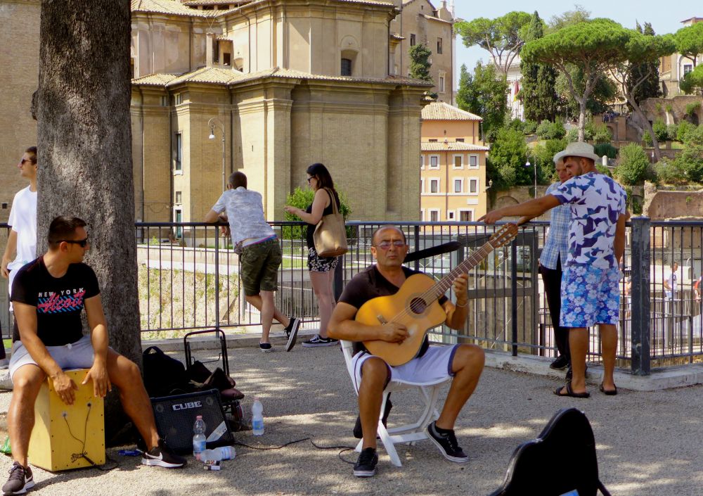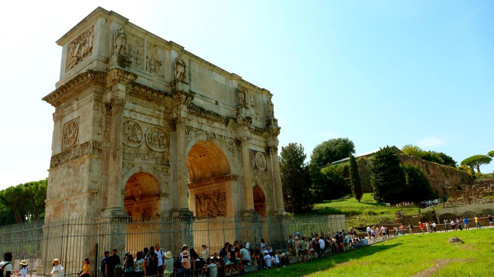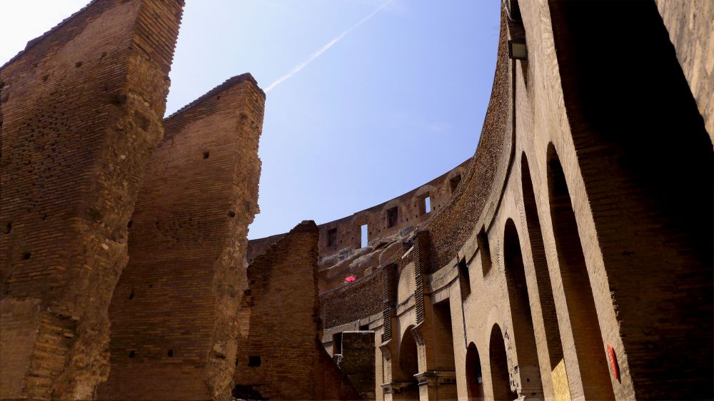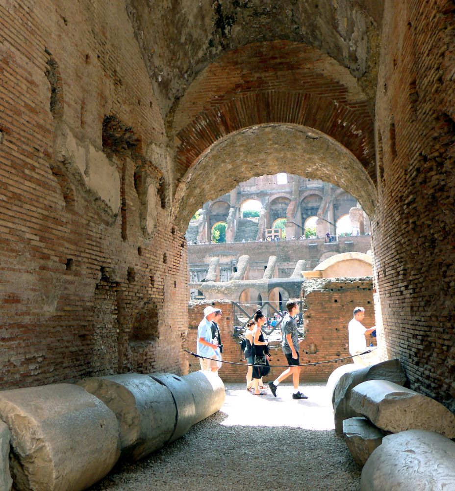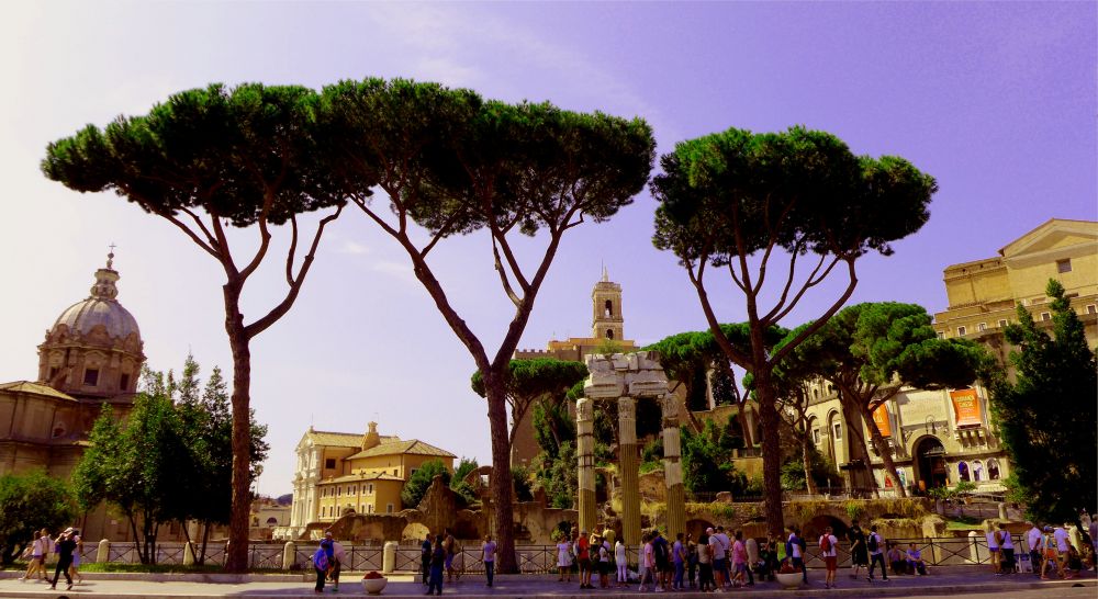这家旅馆是从歌剧院改建的,依然留存着原址富丽堂皇的风格。且座落于热闹方便的商业街上,人来人往,相邻各色餐馆酒吧。时值正午,8月的罗马暑气袭人,我俩走得大汗淋漓。在大堂等候了一阵子,我们预定的房间才可以入住。安置好行李,简单冲个凉,我俩便步出旅馆大门,径直奔向我们计划浏览的两处景点古罗马废墟和斗兽场——