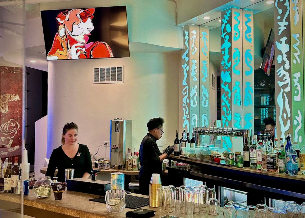 场内提供了侍者托盘递送的各式小吃和几处开放式酒吧
