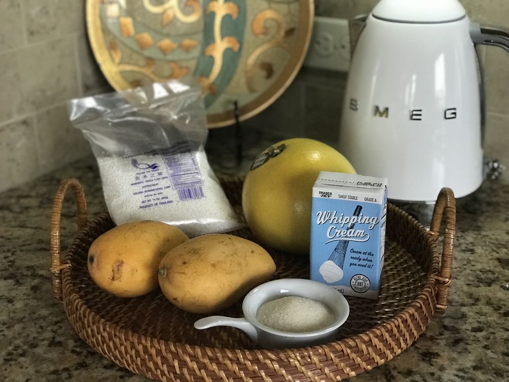 材料(一人份):西米1/4杯,芒果一个,西柚肉少许,淡奶油2大匙。