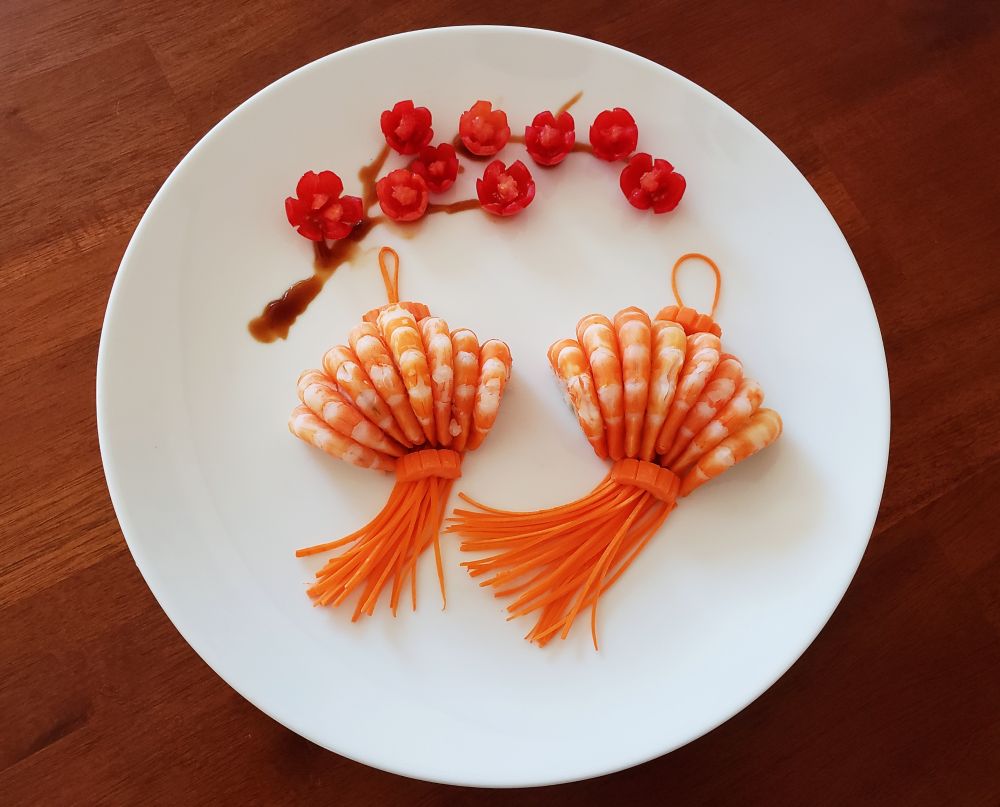 小西红柿,熟虾,胡萝卜。虾下面是土豆泥[
