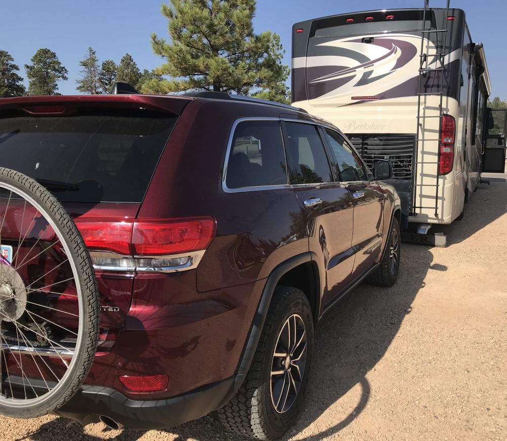 上个月RV旅行,家里原有的两个SUV没有平拖功能,买了一个flattow功能的JeepGrandCherokee,拖车链接是aBlueOx.我也学会了链接RV和Jeep,两人一起干很快就能连接和装卸。