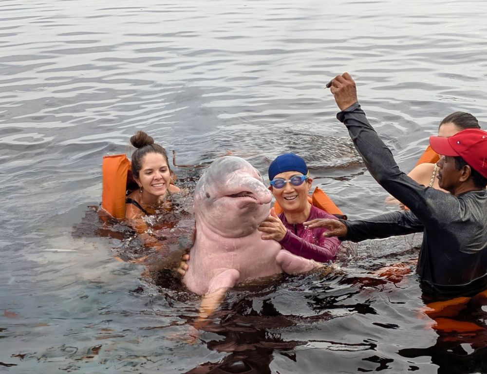 一年多前在秘鲁亚马逊偶见粉海豚跃出水面两秒钟,惊鸿一瞥就沦陷着迷了!这次再来亚马逊就是为了与粉海豚亲密接触。它的皮肤触之似软橡胶,温柔安静地在你身边游弋。传说亚马逊水中的粉海豚每到夜晚便化作英俊帅哥,到岸边与姑娘幽会缠绵;当太阳升起时。他又回到水中还原成粉海豚,陪我等老太太和孩子们游泳。LG为我照相,抱怨[