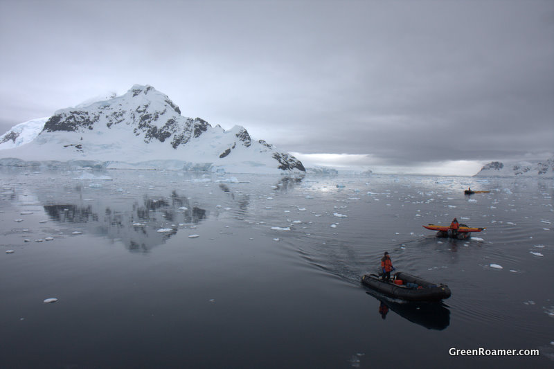 Itisour3rddayintheAntarcticregion.Wewoketoachillymorningwithovercastsky.Thewaterwasexceptionallycalm.ThisisParadiseHarbor.Thelandencirclingtheharboris(finally!)theContinentofAntarctica.CrewsgettingthekayaksreadyEverykayakerwillbepaddlinghere.Thesurfaceoftheharborwasflatasamirror.Noonewantedtomissoneofthebestkayakingconditionswehadonthistrip.AllthekayaksweretetheredtoourzodiacAllofuskayakerswereput...[