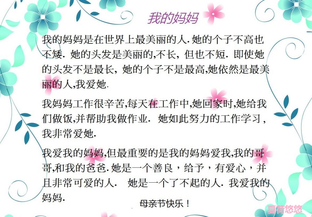 俺家小小荷在学中文呢,最近因为母亲节的原因,被要求用中文写一篇作文“我的妈妈”,于是她星期六一大早就爬起来,在电脑上折腾,据说是用“googletranslate"完成了200多字,当然,我按照她的意思,帮她修改了一下,,