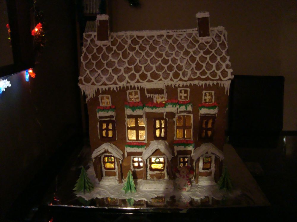房子是根据网上看到的图片作出更改的。先用纸板作出模型,然后刻画姜饼。里面放上圣诞灯。