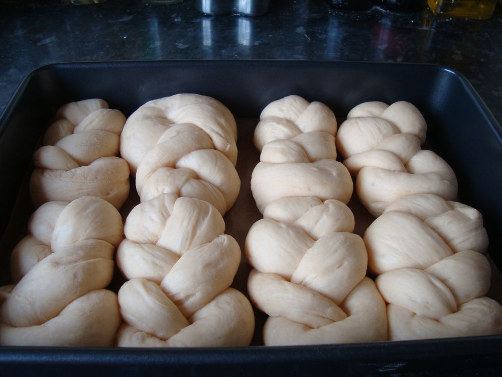 今天照毛毛妈的食谱做了卡士达酱八字面包,很成功,上来感谢毛毛妈!我没有面包机,所以知识用搅拌机揉面,没有面筋粉,所以用的是面包粉,上面没有刷蛋黄液,是烤好后刷蜂蜜水,仍然很成功,内部组织拉丝得很好,超松软,好好吃,真开心![