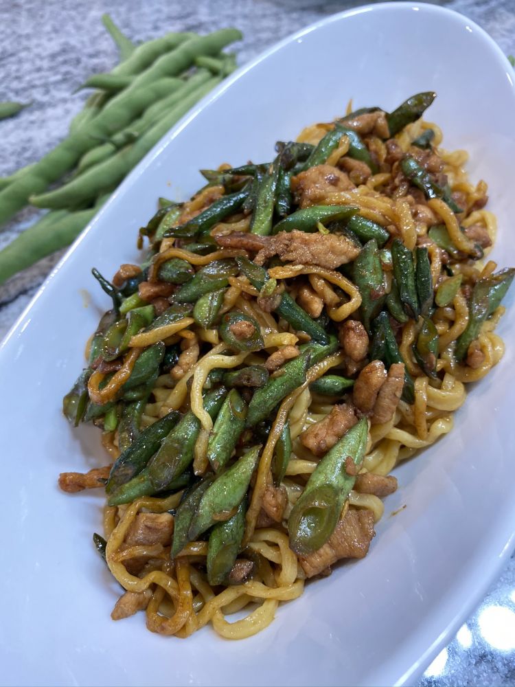 做法:肉丝加上调料腌制十分钟,锅内放油,油开加入腌好的肉,炒熟之后拿出备用,加入豆角小块煸炒至熟,加入煮好的面条翻炒均匀即可。