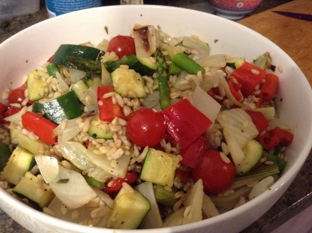 原料:大麦Barley半杯,茴香头一个,西葫芦瓜courgett一个,红甜椒一个,小西红柿一把。