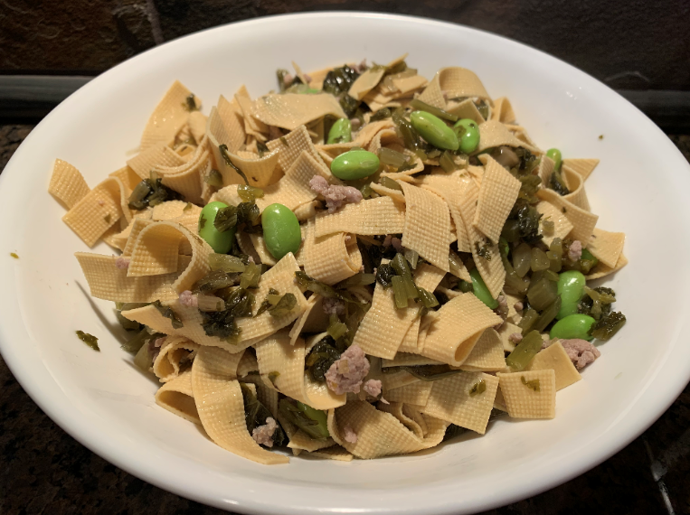 食材:雪菜、高碑店豆皮、肉糜50克、冷冻毛豆