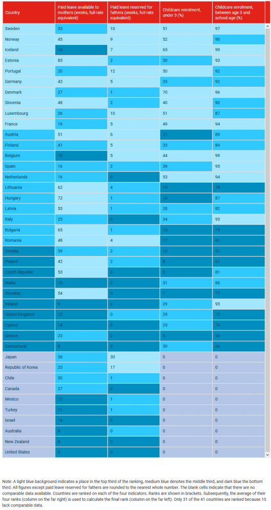 评估包括新生婴儿出生,母亲及父亲带薪休假的时间及三岁以下儿童的入学率。