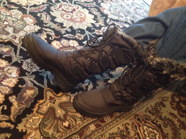 以前很少穿雪靴,以为只要防水防滑就好,去了一家号称全国最大的鞋店,试了好几双,终于买到了妈妈的心头好,要求不能太重;一定防滑;要暖和;走路舒服;当然也要漂亮。这双产地意大利,有高高的靴筒和毛毛,可以包住腿,腿暖和了胃就会舒服很多,我想。花了$210,当然跟妈妈说的是打半价[