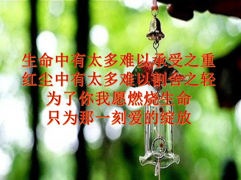 生命中有太多难以承受之重红尘中有太多难以舍弃之轻我愿为你燃烧生命只为那一刻爱的绽放绿叶中有太多难以忘却之伤花蕊中有太多难以萌发之痛我愿化作泥土守护你的身旁只为那一刻花的怒放浩瀚中有太多难以寻觅之星黑暗中有太多难以追求之梦我愿化作流星划过夜空只为那一个你许下的愿望