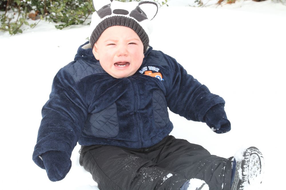 宝宝对雪还没有感念,当妈的就已经迫不及待地想像着宝宝在雪里开心地打滚的样子。今天好不容易把他裹成了粽子抱出了门。估计他对自己被裹成那样不能动弹很不爽,另外也没见过这阵势,一放下地,人家就这样了: