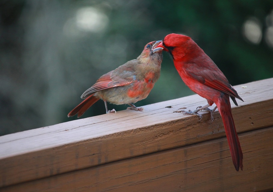 最近在凉台的花架上挂上一个鸟食瓶子,没想到招来了一对红雀情侣,它们经常早上来找食吃,雄鸟殷勤地喂雌鸟,雌鸟则在一旁扇着翅膀等着,那份恩爱你就自己瞧吧!