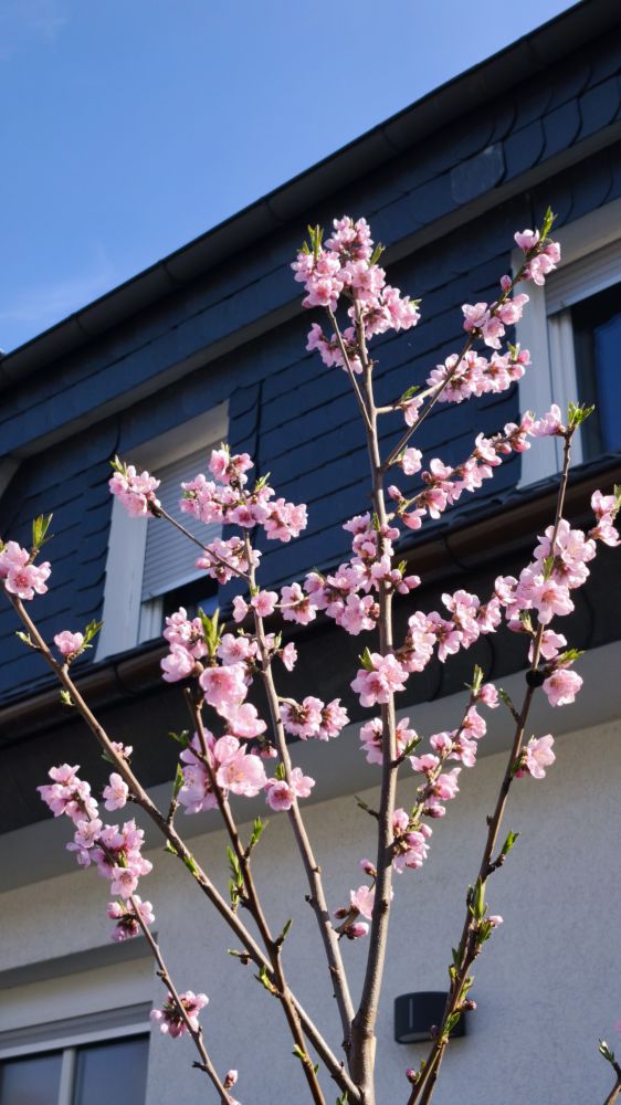 去年买的一棵蟠桃树苗,买的时候,枝头就挂满了小桃,没看见花。今年三月,桃花如约而至[
