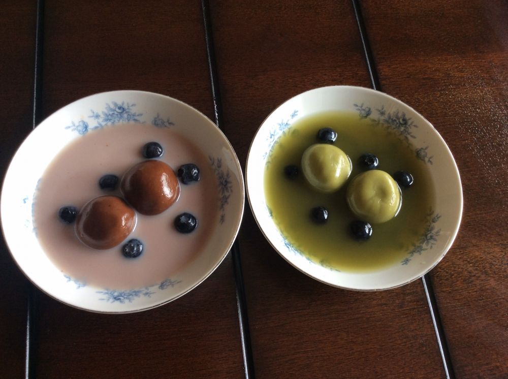1.抹茶汤圆放在抹茶水中,汤圆色做浅些,抹茶水要深些;